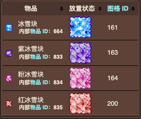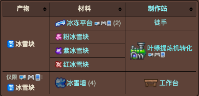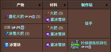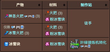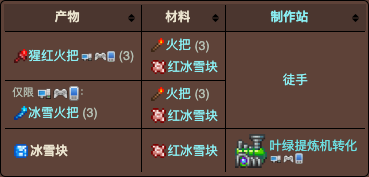 2.粉冰雪块、紫冰雪块和红冰雪块仅能用于制作冰雪火把和它们对应的神圣、腐化和猩红火把。