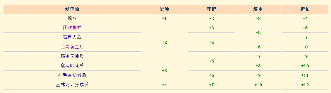 ②对武器、饰品属性进行了调整,除了上面说的盗贼系列调整外,针对防御属性,护佑以及他几个上不了场的小弟。除了提供护甲值以外,还提供伤害减免属性,基础值【护佑:4点护甲值+1%伤害减免】。此外防御词条提供的属性还会随游戏进度得到提升,具体数值如下图。